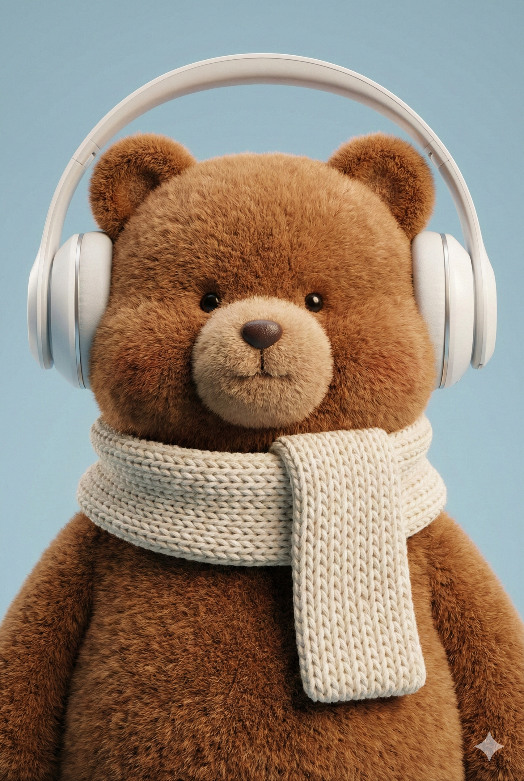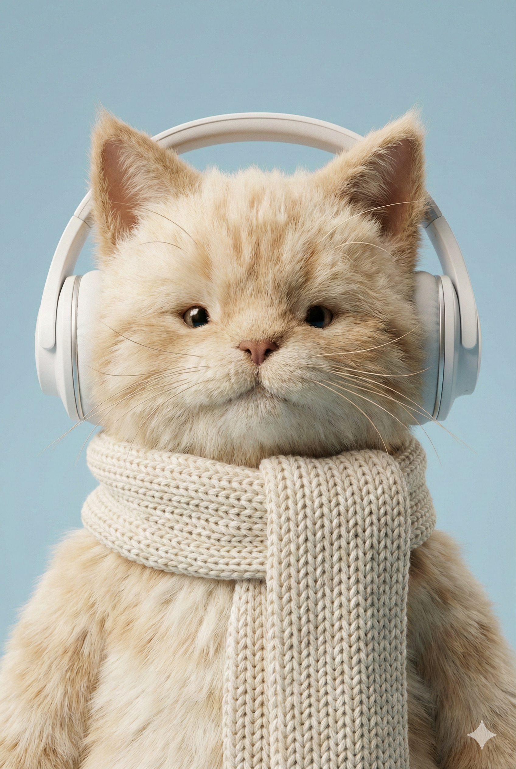 A cute [동물 종류] character plush doll, 3D render style, extremely detailed soft fur texture, fuzzy and cozy, [동물 특징 묘사], wearing white over-ear headphones and a cream-colored chunky knitted scarf, front view, vertical portrait composition, soft studio lighting, high quality, simple pastel blue background, cinematic lighting, 8k resolution